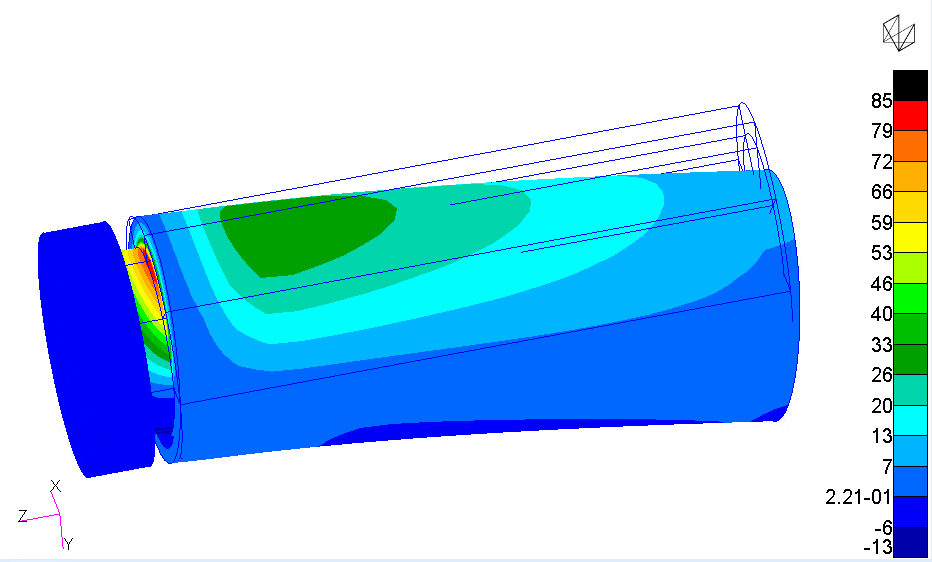 This picture was generated by post-processing to show theoretical stress distribution. Higher stress occurs in red locations, which shows higher risk of failure is assumed around the locations.